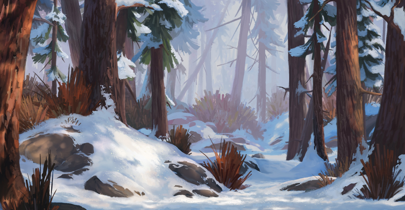 From quiet, snow-covered forests to warm, food-centered interiors, every background was carefully designed to support the story. As the wolf’s journey progresses, the environments gradually become warmer in both color and atmosphere. Subtle shifts in palette, contrast, and texture helped shape this transition, using the backgrounds themselves as a storytelling tool.