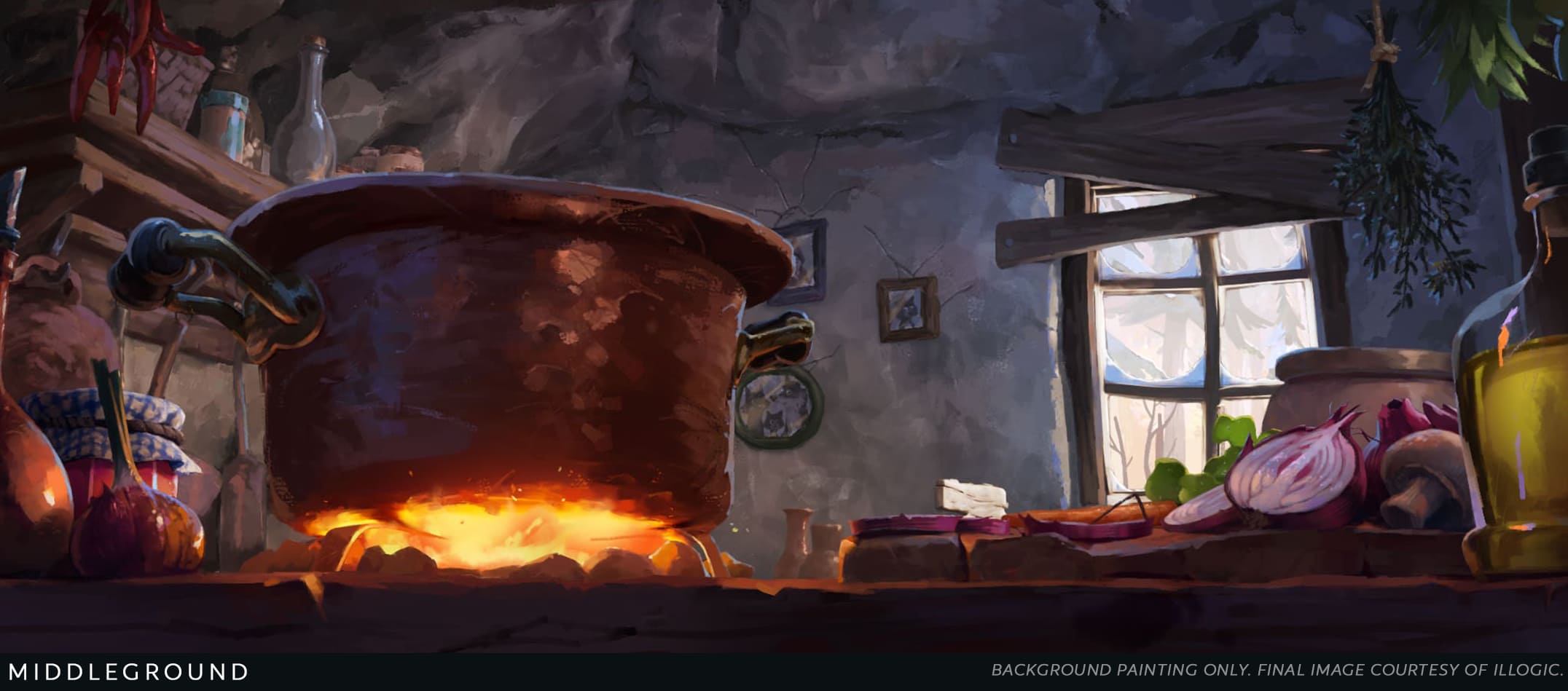 Starting from the 3D plates provided by the studio, we refined each shot through digital matte painting, adding painterly brushstrokes, texture, and depth to bring the environments to life. The process allowed us to move away from a purely technical look and embrace a more hand-painted, expressive approach, while keeping the lighting and perspective grounded in the original 3D scenes.